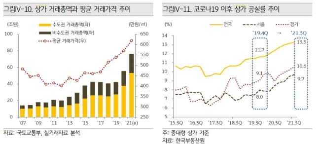 보고서는 "코로나19 영향에도 상가 거래가 늘고 가격이 상승해 지난해 상가 거래총액은 통계 작성 이후 최대치를 경신했다"면서도 "공실률 증가 등 기초여건 대비 자산 가격이 과도하게 상승하면서 버블 위험에 대한 우려가 커질 것"이라고 전망했다.
